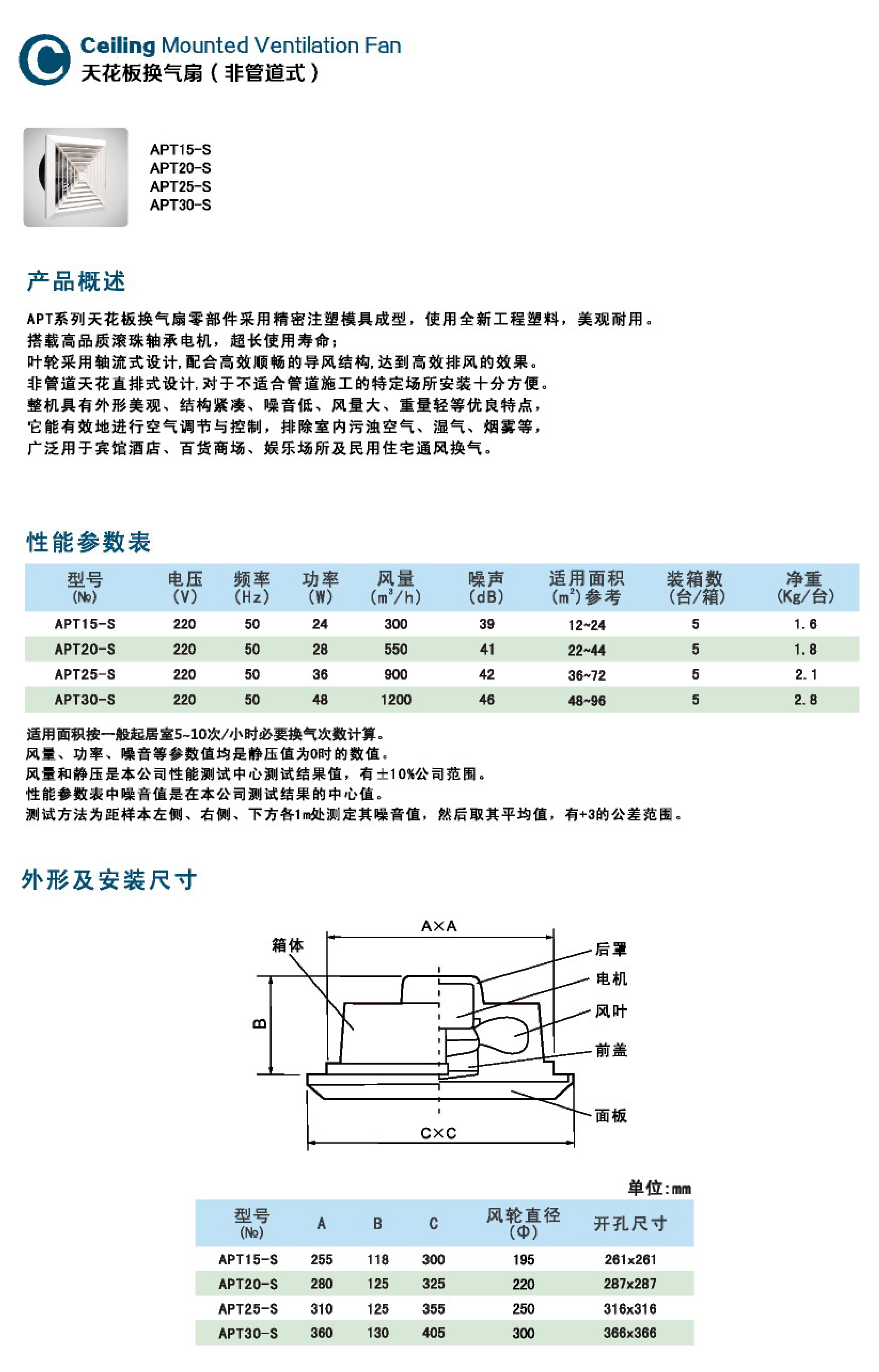 1、APT系列天花板换气扇主要零部件采用精密模具成,使用全新工程塑料,美观耐用。