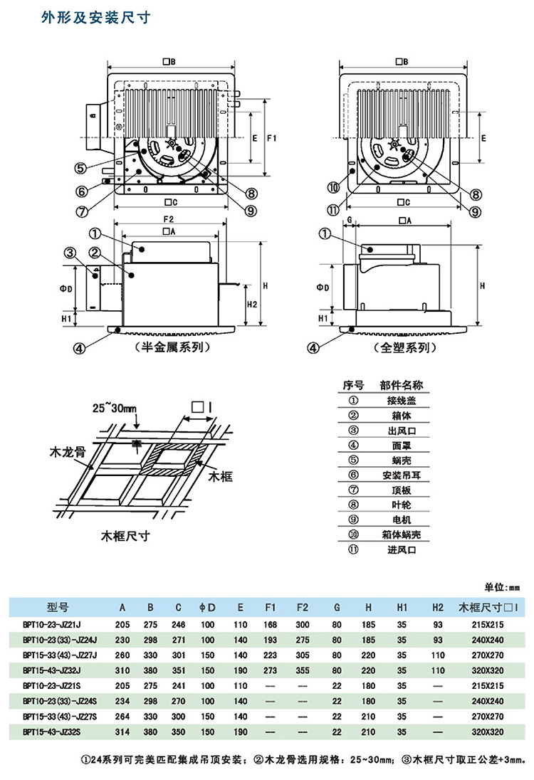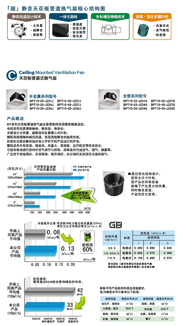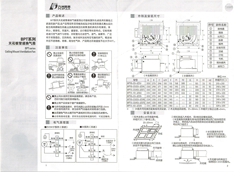 1、BPT系列天花板管道换气扇主要零部件采用精密模具成型