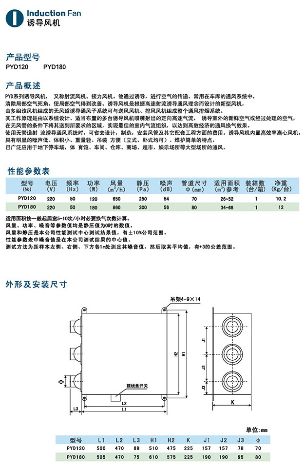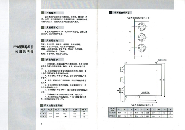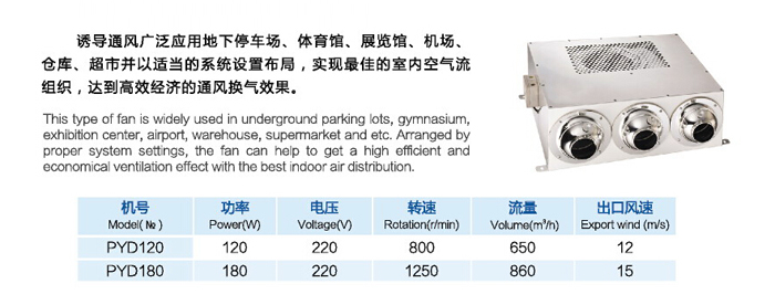 1、PYD系列诱导风机,又称射流风机,接力风机,他通过诱导,进行空气的传递,常用在车库的通风系统中,