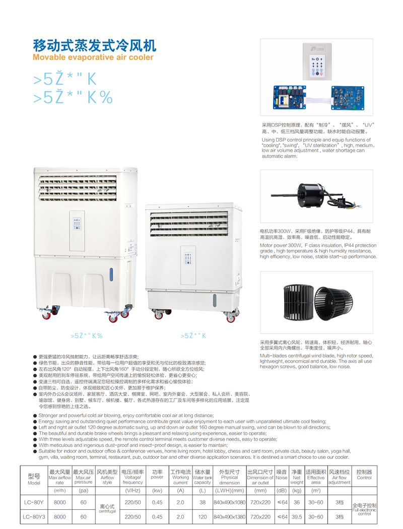 采用DSP控制原理,配有“制冷”,“摆风”,“UV”,高、中、低三挡风量调整功能。缺水时能自动报警